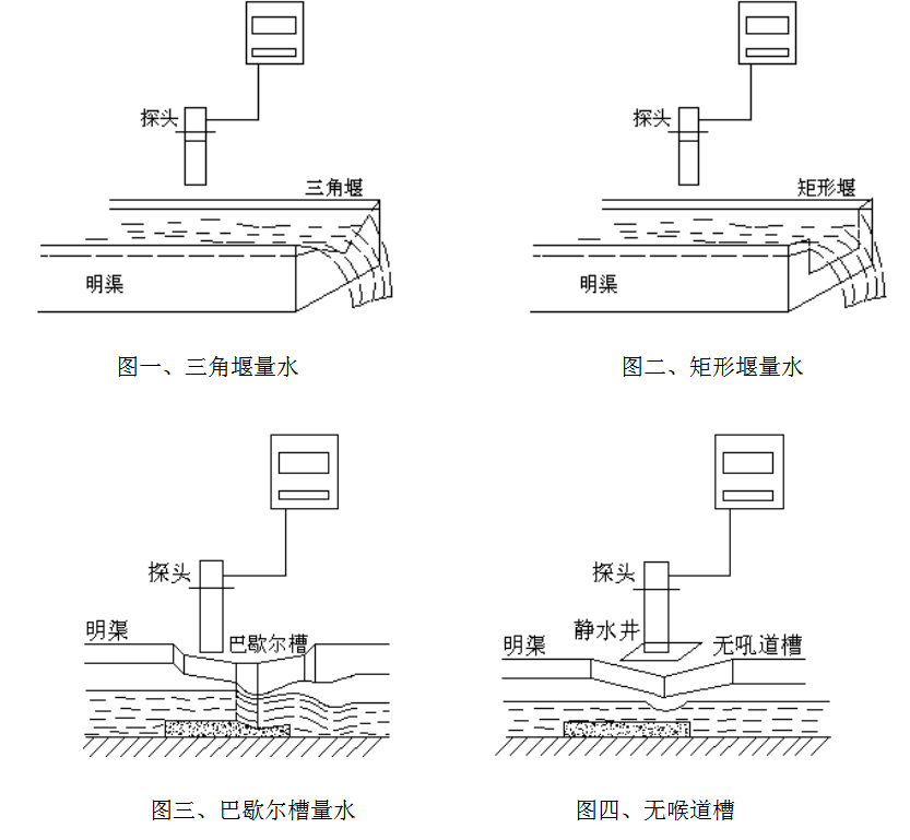 两水堰槽安装在明渠水路的中途或末端,利用堰或槽的节流作用,使流经堰槽时的水的液位与流量形成确定的对应关系。仪表的超声波探头安装在量水堰槽水位观测点上方,以测量堰槽的水位流量对应关系反推出流量